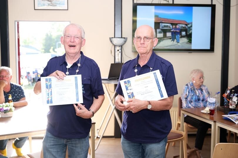 Ook het bestuur van de afdeling was uitgenodigd en die besloot dit uniek jubileum op te luisteren met de uitreiking van de bronzen speld van de Afdeling aan beide heren met de wens om samen nog vele jaren te genieten als combinatie binnen onze mooie sport.